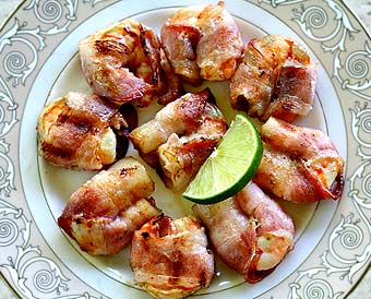 I was looking for something to spice up tomorrow’s grilling menu. I do love the tri-tip, chicken, burgers, sausages and grilled veggies that are our barbecue norm, but I always come up lacking in the seafood department. I know bacon-wrapped shrimp isn’t exactly boundary-breaking, but check out this recipe. I love the flavor of chipotle and am always anxious to try new recipes using this smoky pepper. I think I’ll chop up some canned chipotle instead of using chipotle powder. And I’m DEFINITELY going to use more than 12 shrimp and 6 slices of bacon.